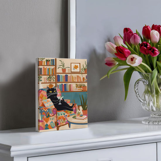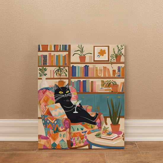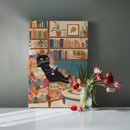 A playful, artful Wrapped Canvas piece for book lovers, cat people, and cocktail connoisseurs like this lounging black cat knows how to unwind in style.