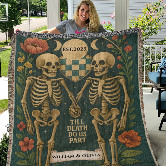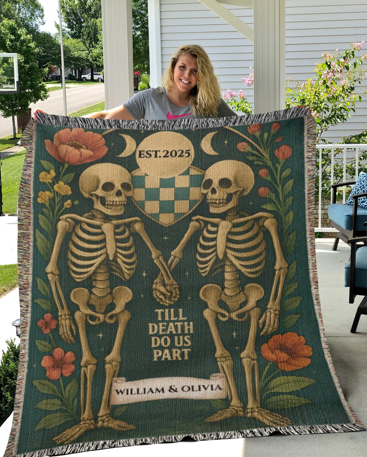 Personalized Skeleton Couple 'Till Death Do Us Part' |Spooky Halloween Tapestry Artwork Heirloom Woven Blanket