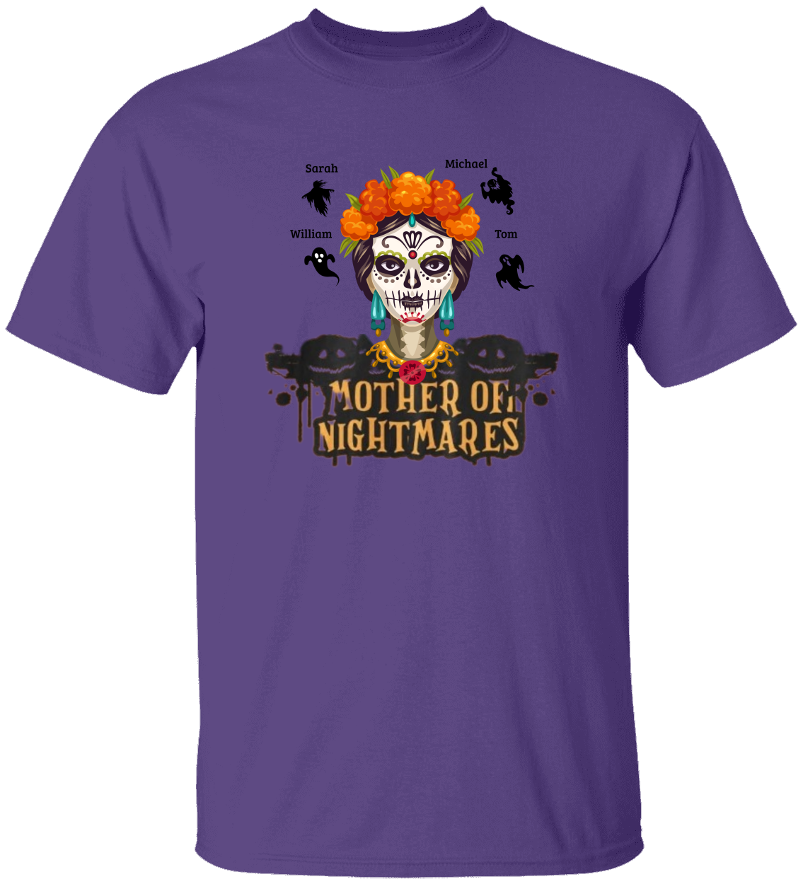 Embrace a unique style with this custom "Mother of Nightmares" heavy cotton tee, perfect for those who love a distinct, bold look. The design features a vibrant Day of the Dead inspired skull adorned with colorful flowers and jewels, set against a rich burgundy background. Around the main image, there are silhouettes of various creatures and names for a personalized touch, making it ideal for family gatherings or spooky celebrations.