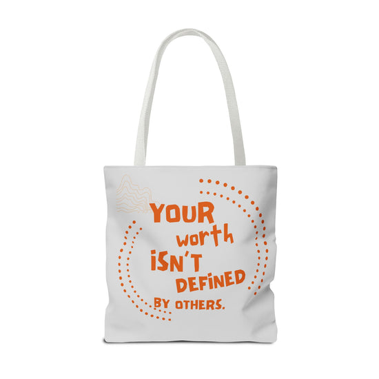Crafted with high-quality spun polyester, this tote is designed to last. The featured design includes a bold and empowering quote, encircled by a playful arrangement of dots in vibrant orange, set against a clean background.