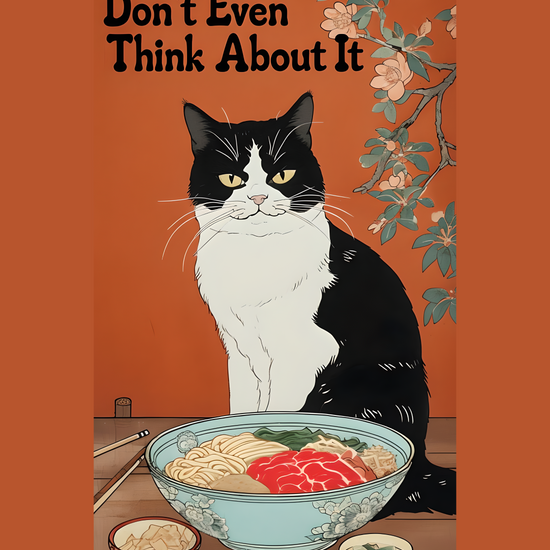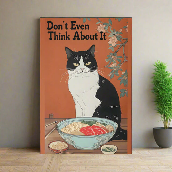 “Don't Even Think About It,” this canvas brings humor and personality no-nonsense tuxedo cat guarding its ramen bowl.