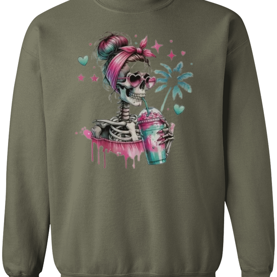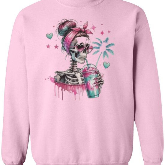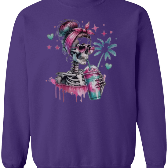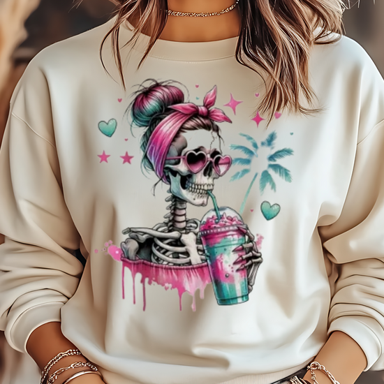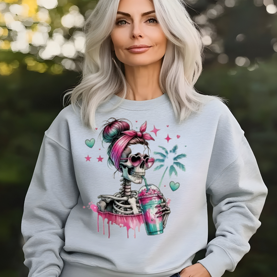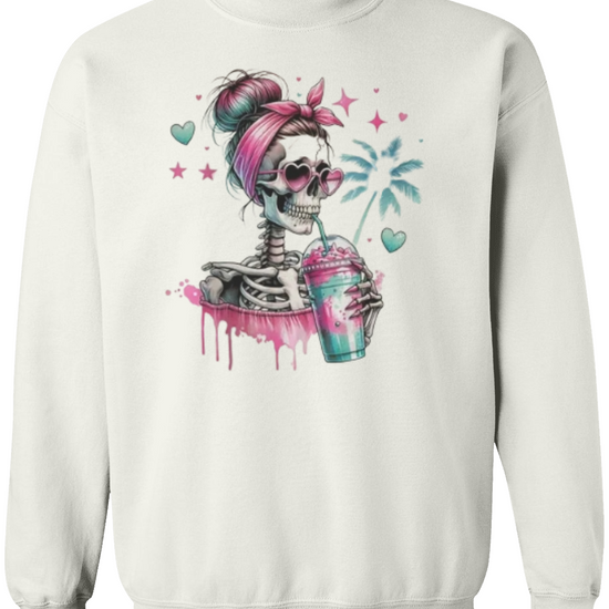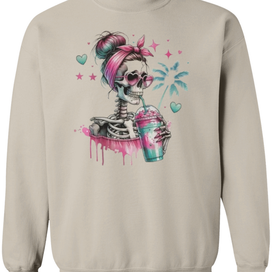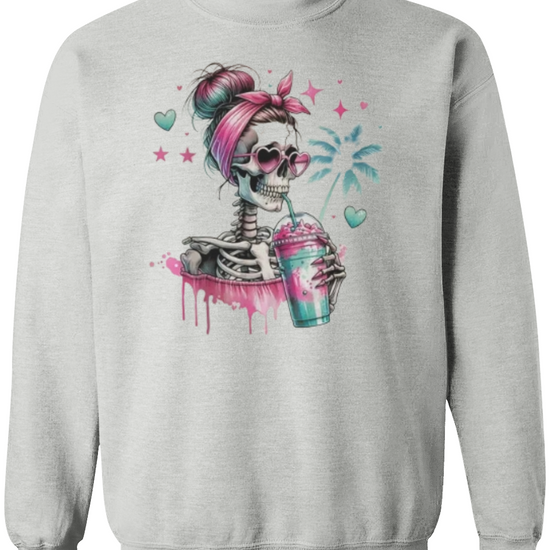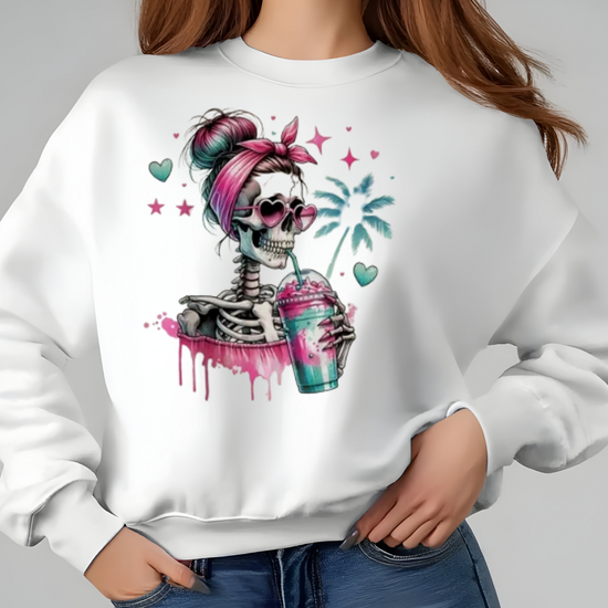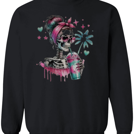 Unleash your playful side with this funky skeleton sweatshirt, perfect for fashion-forward individuals who love to stand out. Crafted with a vibrant skeleton enjoying a colorful drink, this design is sure to turn heads. The skeleton flaunts stylish sunglasses, a whimsical hairdo in pink tones, and a cheerful expression, complemented by fun elements like hearts and stars that surround the artwork.