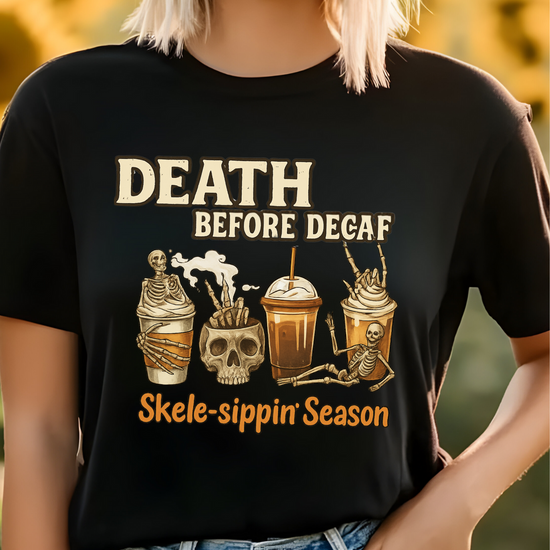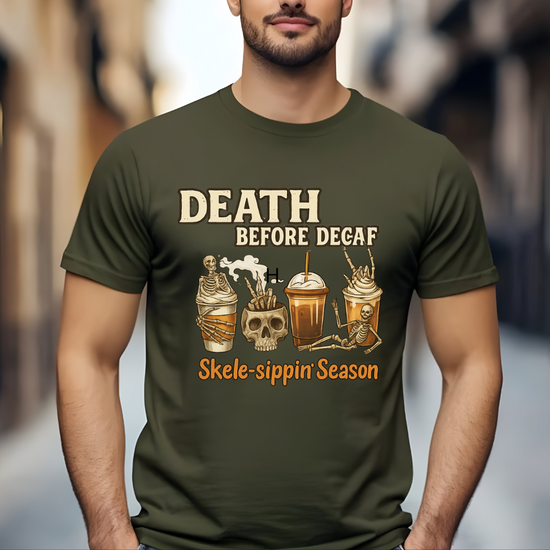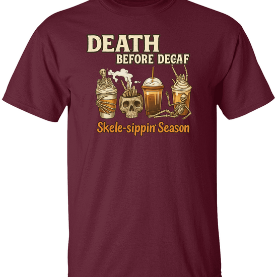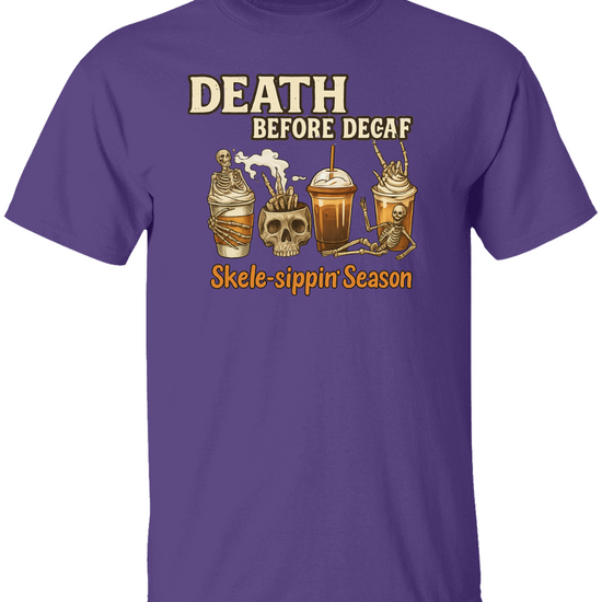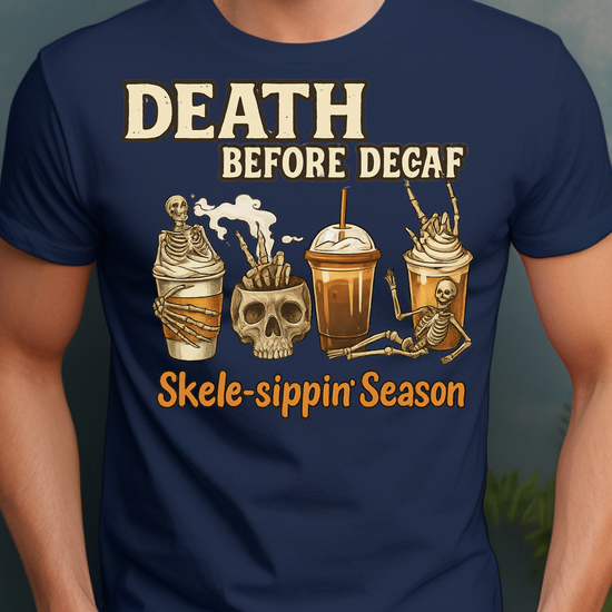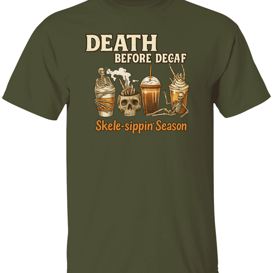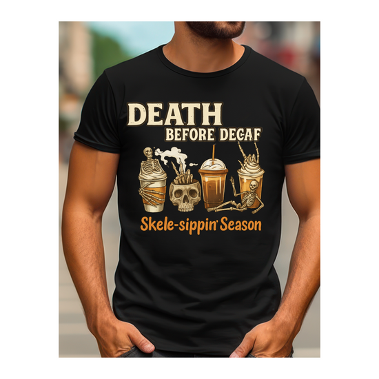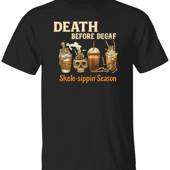 Funny Skeleton Coffee "Death Before Decaf" T-Shirt