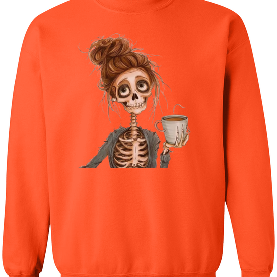 Get cozy this Halloween with our vibrant orange sweatshirt featuring a whimsical skeleton design. Perfect for spooky season, its high-quality print showcases a skeleton holding a coffee mug, adding a playful and quirky touch to your outfit.