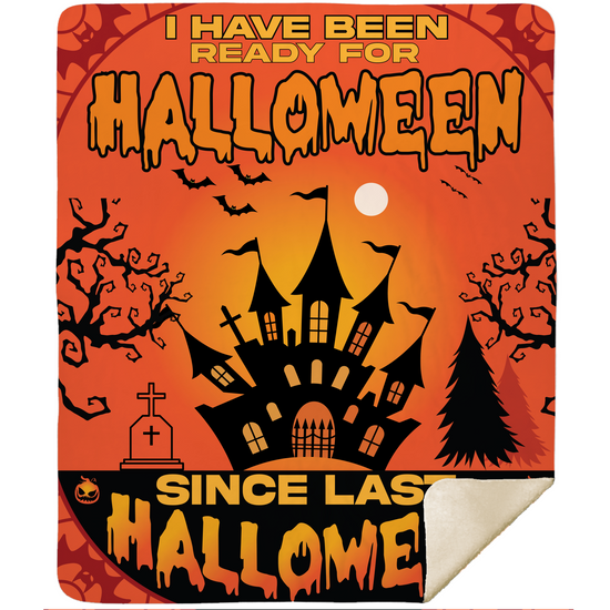 The design boasts a vibrant, full-color print that bleeds edge to edge on one side, featuring iconic Halloween imagery like haunted houses, eerie trees, and mysterious bats silhouetted against a glowing orange backdrop. This blanket not only brings warmth but also adds a festive touch to your home decor during the Halloween season.