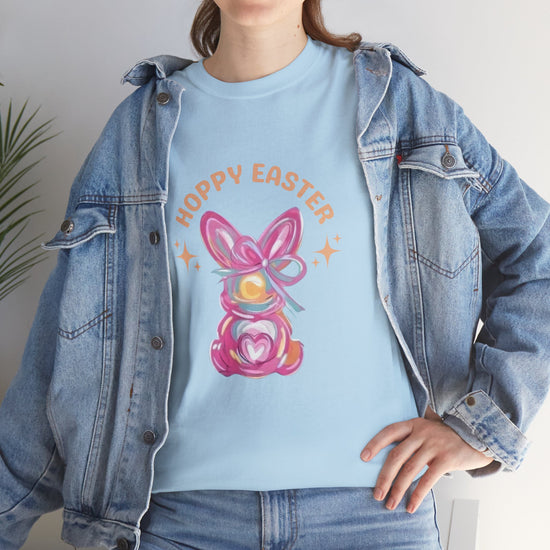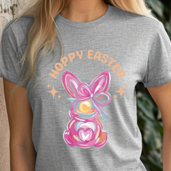 🐰 Hop into the Easter spirit with our charming "Hoppy Easter" Bunny Shirt! This delightful kids' tee features an adorable, vibrant illustration of a pink bunny, complete with a big bow, radiating warmth and joy. The playful design includes cheerful stars and "Hoppy Easter" text, capturing the essence of fun, family, and springtime celebrations.