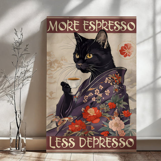 “More Espresso, Less Depresso” says it all—bold, calm, and caffeinated. A chic black cat in a floral kimono Gallery Wrapped Canvas.
