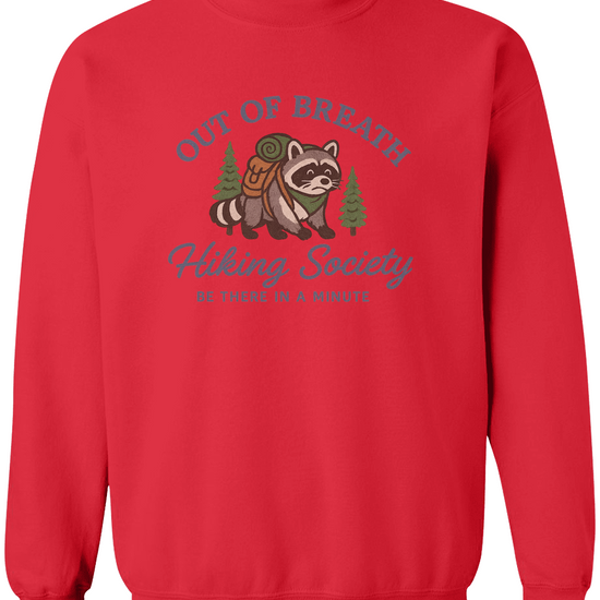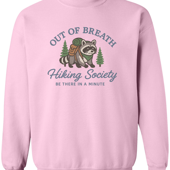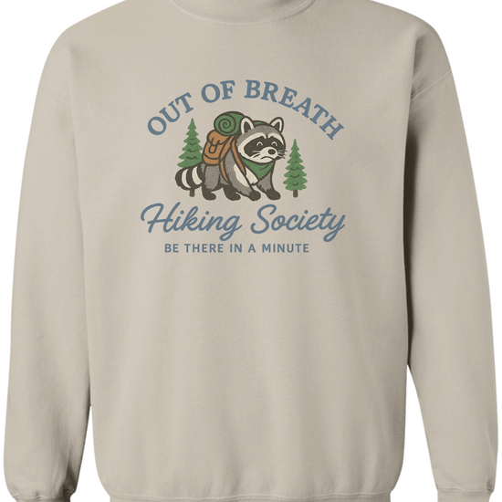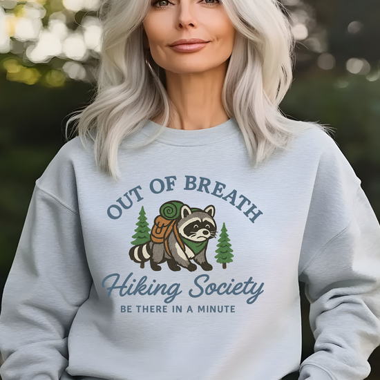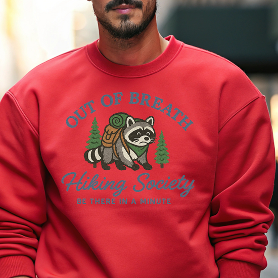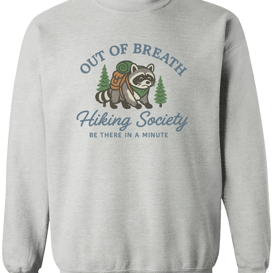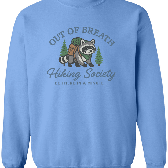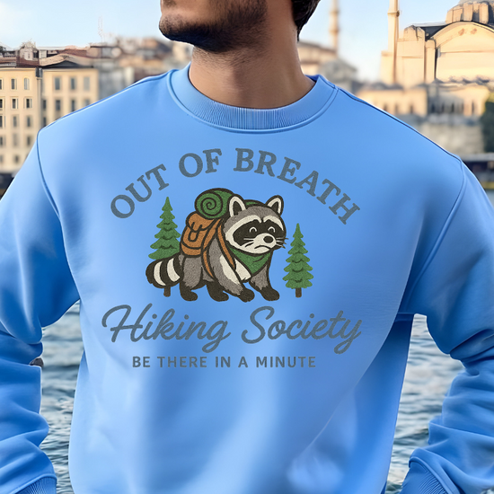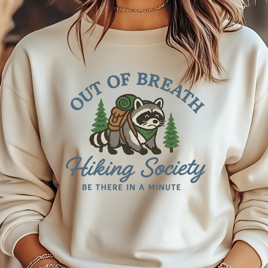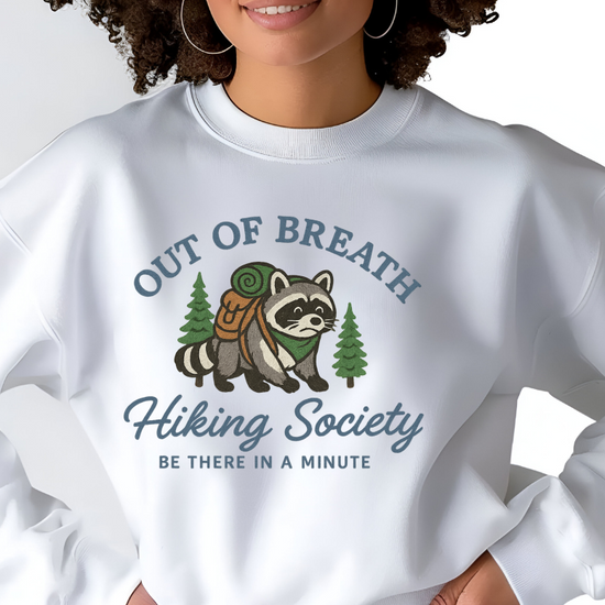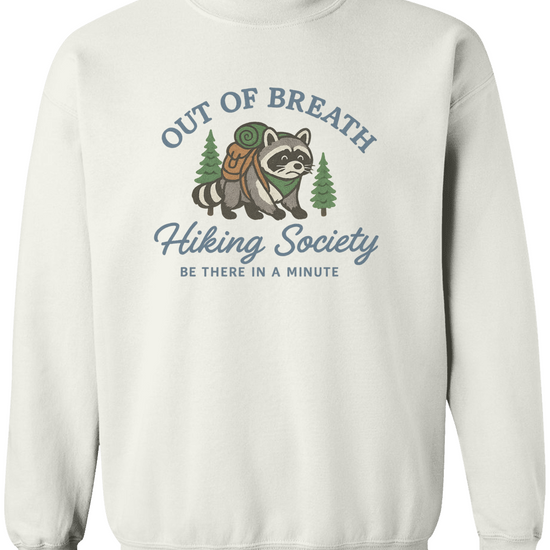 Embrace your love for hiking and humor with the "Out of Breath Hiking Society" sweatshirt. This cozy top features a spirited raccoon ready for an adventure, capturing the essence of every outdoor enthusiast who enjoys the journey as much as the destination.