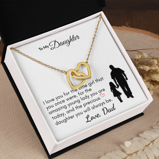 💝 Surprise your beloved daughter with an elegant Interlocking Hearts Necklace that symbolizes your eternal bond. This exquisite piece features two beautifully intertwined hearts, one adorned with shimmering cubic zirconia crystals, offering a stunning contrast between dazzling sparkle and sleek gold finish.