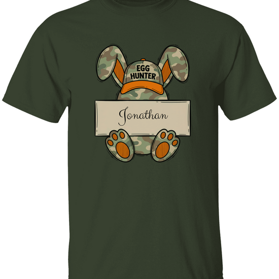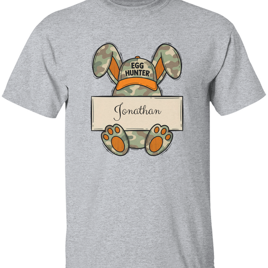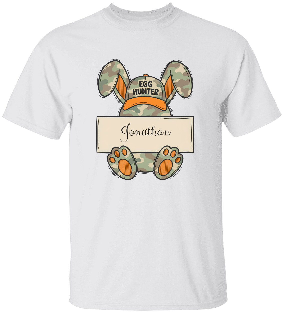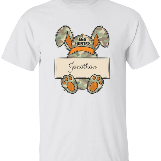 🐰 Make Easter extra special with our Personalized Easter Kids T-Shirt! This delightful tee features a playful design starring a cartoon bunny with camouflage ears and a matching hat labeled 'EGG HUNTER'. The bunny holds a sign that proudly displays your child's name, adding a unique touch to their Easter festivities. Ideal for playful hunts and family gatherings, this shirt is not only adorable but also comfy.