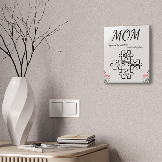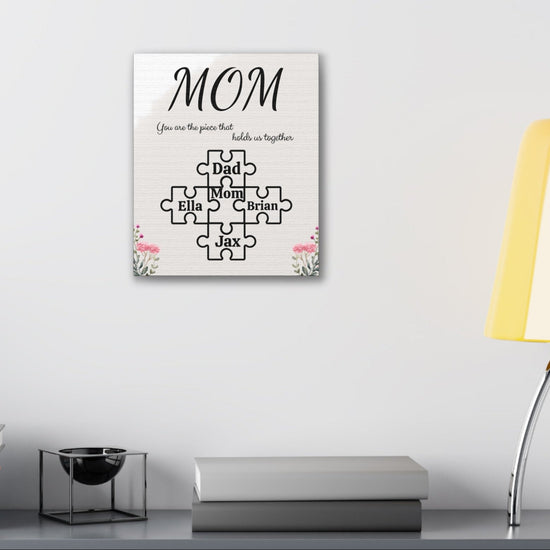 Featuring a beautiful puzzle layout with custom names, this artwork highlights Mom at the center — surrounded by the ones she loves most. The touching message: