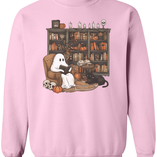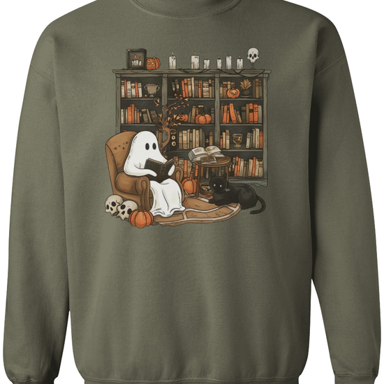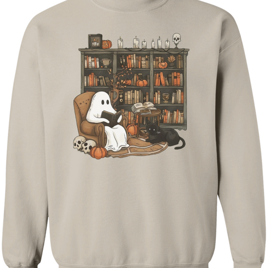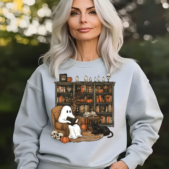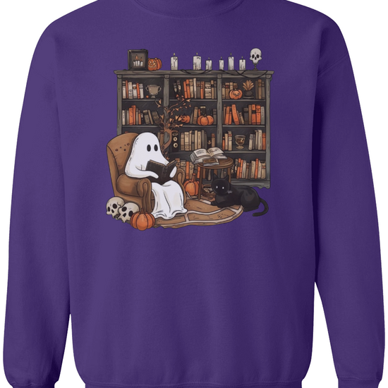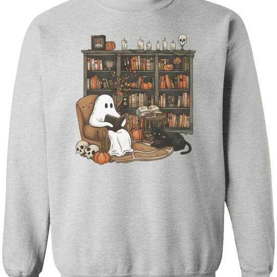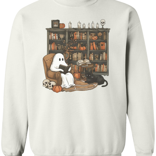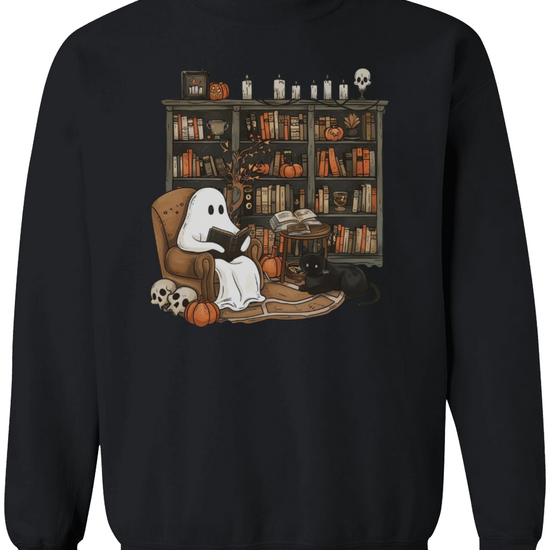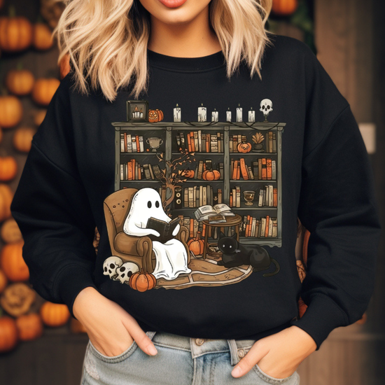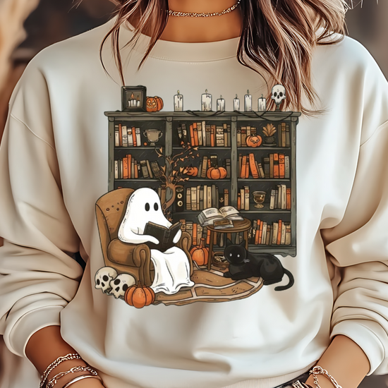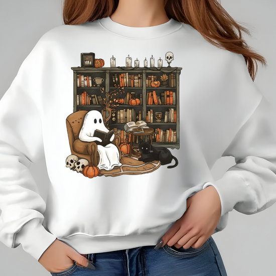 Embrace the whimsical charm of Halloween with our Retro Ghost Reading Sweatshirt. Perfect for librarians, teachers, and book lovers, this unique design showcases a serene ghost indulging in a book. The artwork features a cozy armchair scene with a ghost wrapped in a sheet, a loyal black cat by its side, amidst a backdrop of a rustic bookshelf filled with books and festive pumpkins.