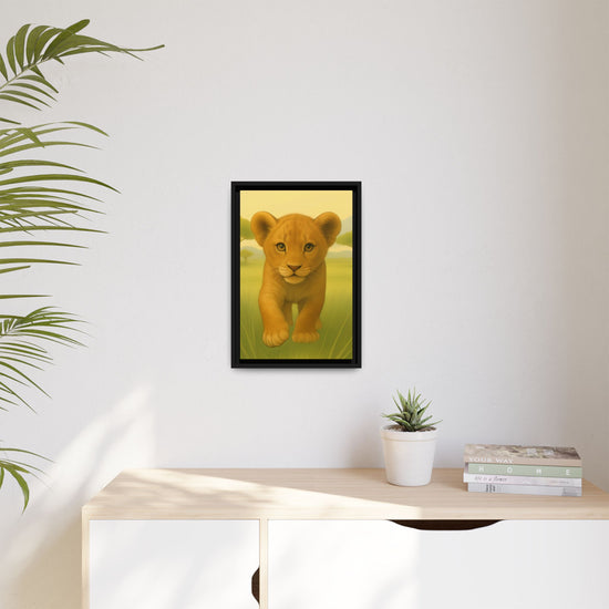 Brighten up your nursery with this adorable Lion, Giraffe and Elephant cub wall art, framed in a natural pinewood frame. The captivating image of a curious lion cub walking through a lush savanna is printed on a high-quality cotton-polyester canvas, ensuring colors stay vibrant over time. Crafted with sustainably sourced materials, this eco-friendly art piece is ideal for environmentally conscious parents.