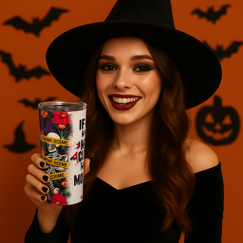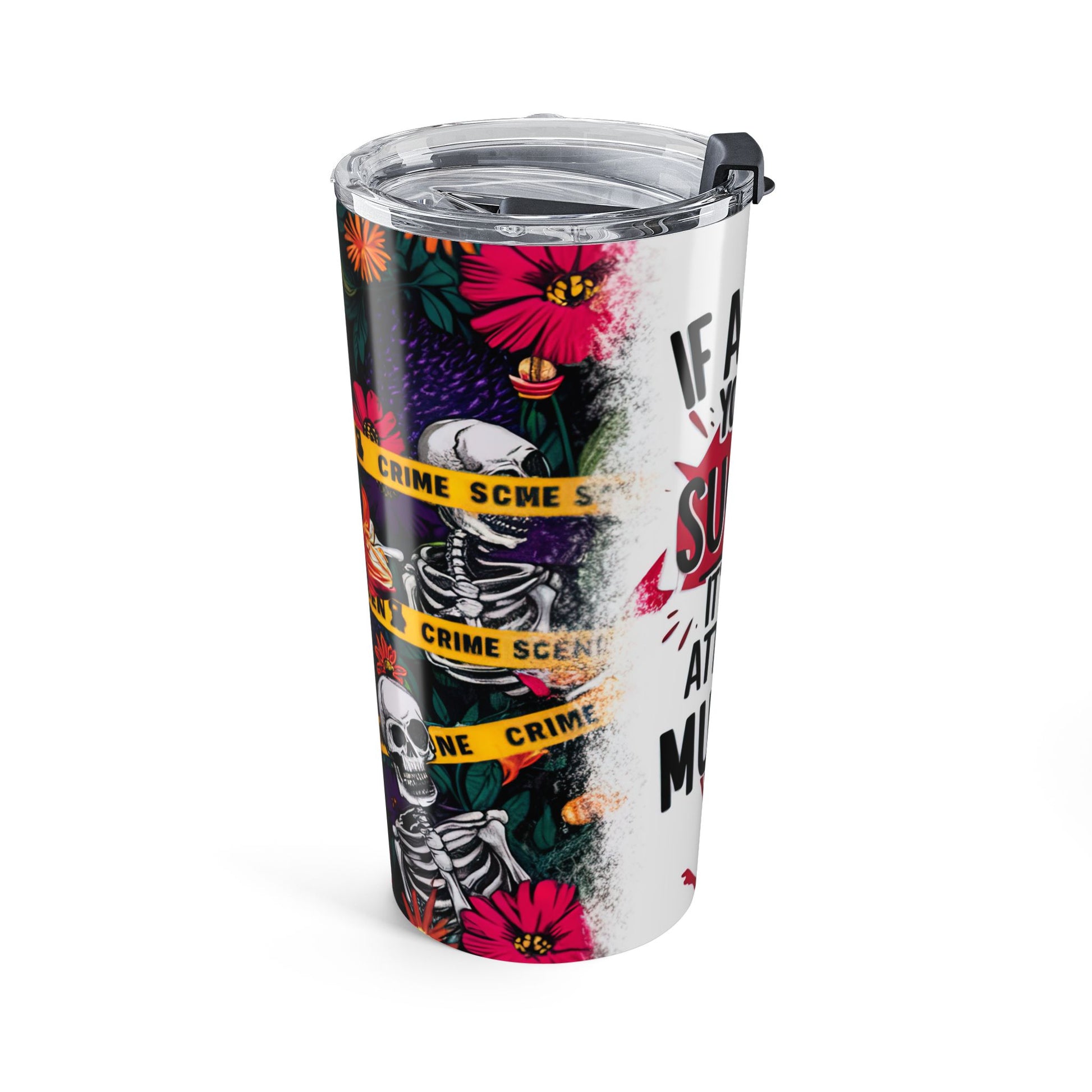 Step up your beverage game with this eye-catching 20oz Stainless Steel Tumbler, featuring a unique and bold design. The tumbler showcases a striking illustration of skeletons intertwined with colorful flowers and accented with playful crime scene tape patterns. This visually engaging piece is perfect for anyone who appreciates edgy and artistic designs.