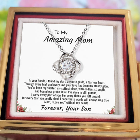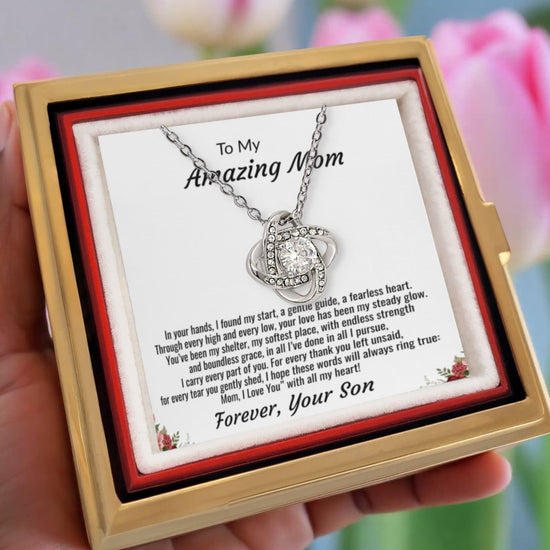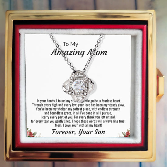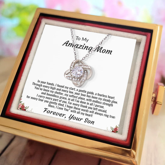 To My Amazing Mom "I Love You with all my Heart" Love Knot Necklace with rotating rose gift box.
