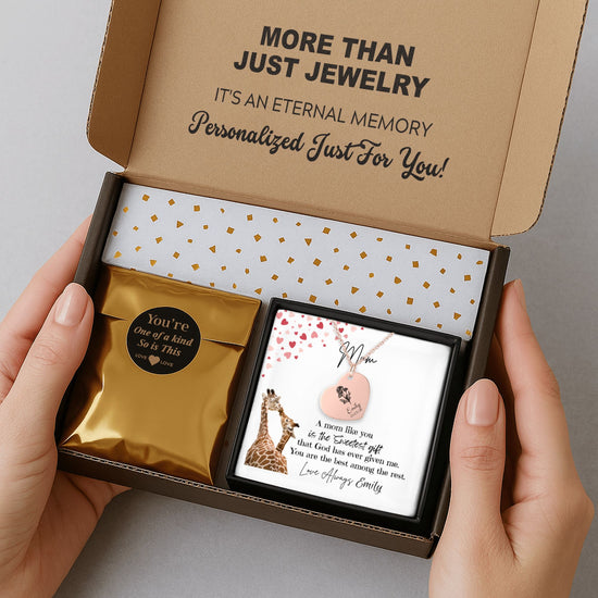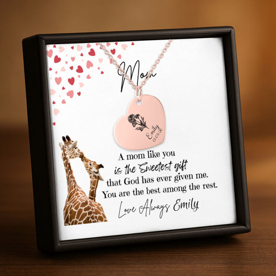 This “To My Mom” Personalized Heart Necklace is a heartfelt keepsake designed to express love, gratitude, and appreciation. Featuring a delicate heart pendant engraved with your name and paired with an adorable giraffe message card illustration, this piece symbolizes warmth, nurturing, and unconditional love—just like mom.
